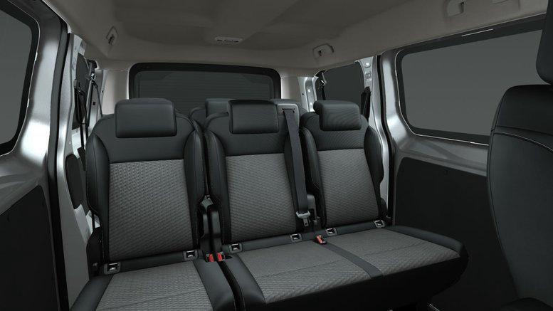 • 8 Sitzplätze (Fahrersitz: 6-fach manuell einstellbar, mit Lendenwirbelstütze und Armlehne / Beifahrersitz: 4-fach manuell einstellbar, mit Armlehne / Sitzbank 2/3 zu 1/3 in der 2. und 3. Sitzreihe mit einzelnen Rückenlehnen, umklapp- und herausnehmbar, mit ISOFIX-Vorrüstung / Haltegriffe, beweglich, in der 2. und 3. Sitzreihe sowie auf der Beifahrerseite in der 1. Sitzreihe / Manuelle Schiebetür, mit festem Fenster / Fahrer- und Beifahrerseite, in der 2. Sitzreihe)